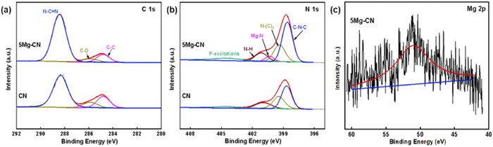 Figure 2.  (a) C 1s and (b) N 1s XPS spectra of CN and 5Mg-CN. (c) Mg 2p XPS spectra of 5Mg-CN.