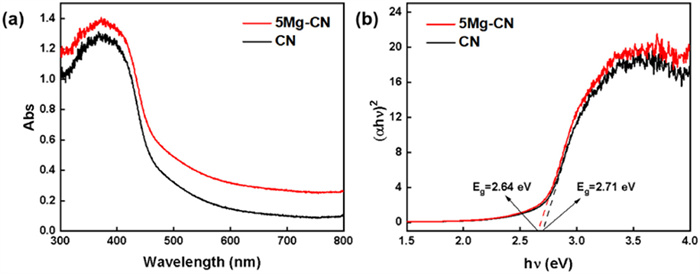 Figure 3.  (a) UV–vis spectra and (b) plots of (αhυ)2 vs. photon energy of CN and 5Mg-CN.
