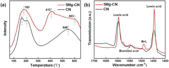 Figure 4  (a) NH3-TPD plots and (b) pyridine adsorption diffuse reflectance infrared Fourier transform spectra of CN and 5Mg-CN.