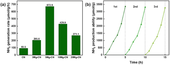 Figure 5.  (a) Effect of Mg amount on the photoactivity of FLPs-like catalysts. (b) Stability test of 5Mg-CN catalyst.