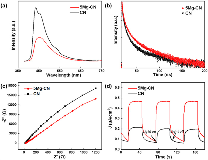 Figure 6  (a) Ambient PL spectra, (b) time-resolved PL decay curves, (c) EIS Nyquist plots and (d) transient photocurrents of CN and 5Mg-CN.