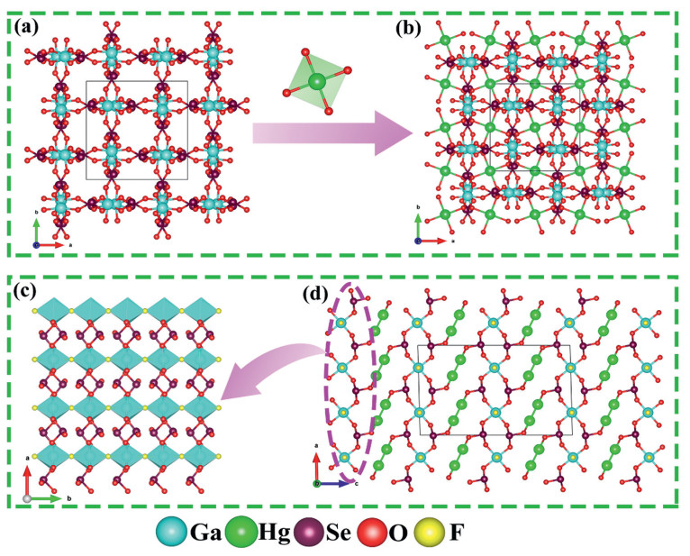 Figure 2  (a) The 3D mercury selenate structure, (b) 3D structure of HgGa2(SeO3)4. (c) The 2D gallium selenite layered structure and (d) 3D structure of Hg2Ga(SeO3)2F.