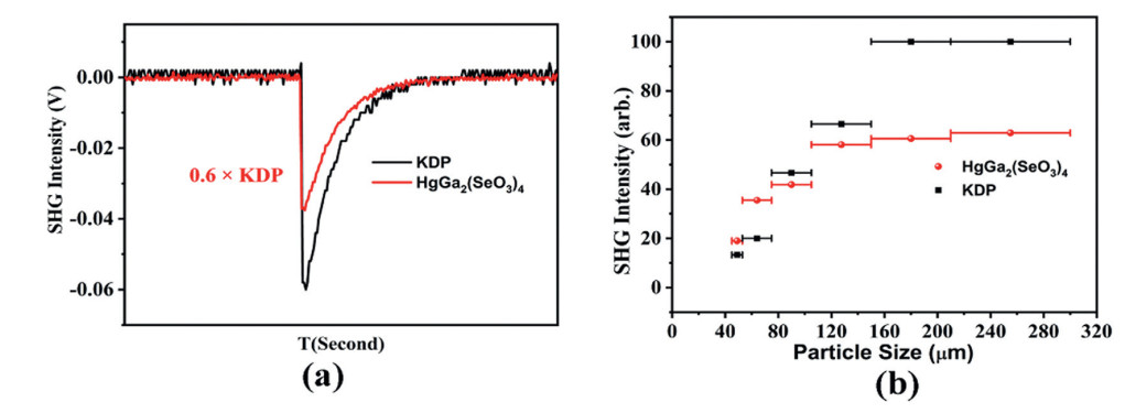 Figure 3.  (a) The oscilloscope traces of the SHG signal, and (b) the measured SHG signals with different particle sizes for HgGa2(SeO3)4.
