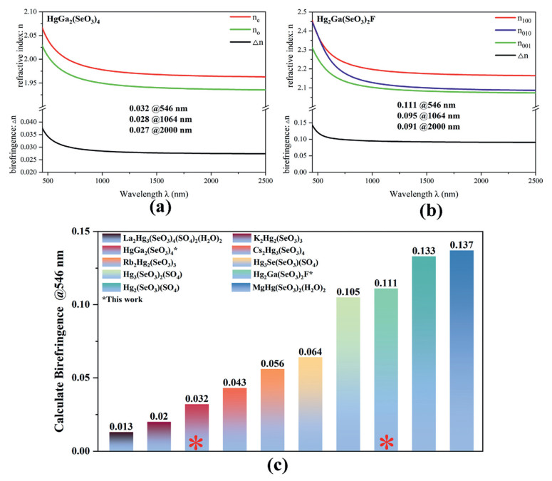 Figure 4.  The calculated refractive indices and birefringence values of (a) HgGa2(SeO3)4 and (b) Hg2Ga(SeO3)2F. (c) The birefringence of the reported Hg-based selenite crystals.