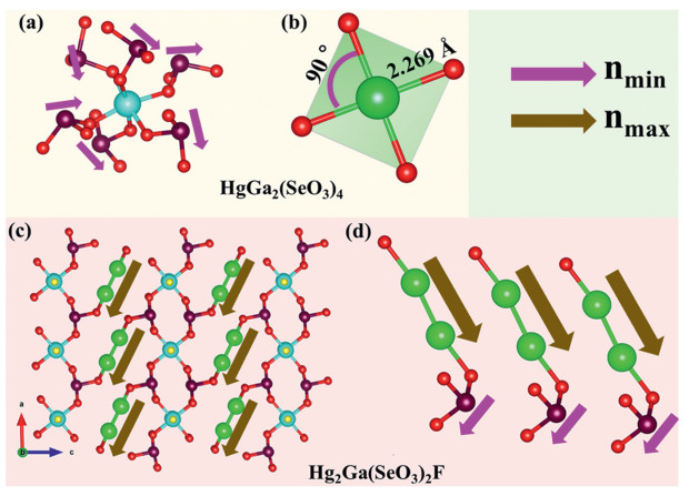 Figure 5  (a, b) The schematic diagram illustrating the cancellation of effects in HgGa2(SeO3)4. (c, d) The Schematic diagram of the synergistic effect in Hg2Ga(SeO3)2F.