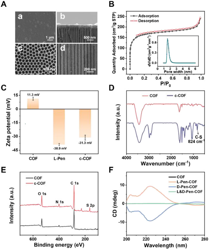Figure 1  (A) SEM images of the c-COF/AAO membrane (a: top; b: cross-section; c: bottom of the membrane. d: cross section of AAO). (B) N2 adsorption/desorption isotherm and pore size distribution profile (inset) of c-COF. (C) Zeta potential of the COF, l-Pen and c-COF. (D) FT-IR spectra of COF/AAO membrane and c-COF/AAO membrane. (E) XPS spectra of COF/AAO (black curve) and c-COF/AAO membrane (red curve). (F) CD spectra of the COF, l-Pen-COF, d-Pen-COF and L & D-Pen-COF (the black curve of COF overlaps with green curve of L & D-Pen-COF).
