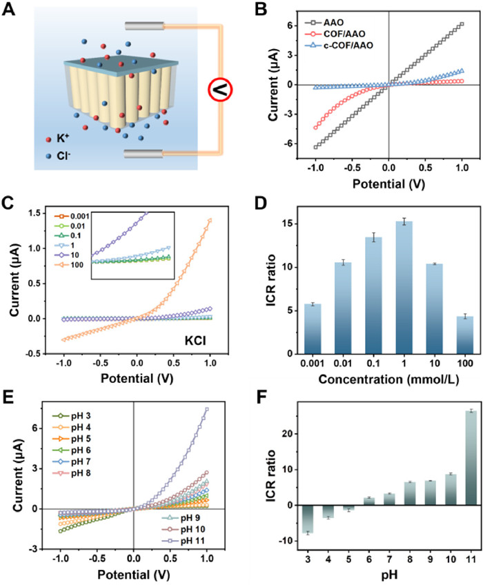 Figure 2.  Ion transport properties of c-COF/AAO membrane measured in KCl electrolyte. (A) Schematic illustration of the setup for the measurement of - curves. (B) - curves of AAO, COF/AAO and c-COF/AAO membrane. (C) - curves and (D) ICR ratio of the c-COF/AAO membrane in various concentration of KCl solutions ranging from 0.001 mmol/L to 100 mmol/L. (E) - curves and (F) ICR ratio of the c-COF/AAO membrane measured in 100 mmol/L KCl solution at different pH values (3–11). Applied a transmembrane voltage between −1.0 Ⅴ and +1.0 Ⅴ.