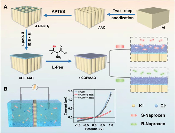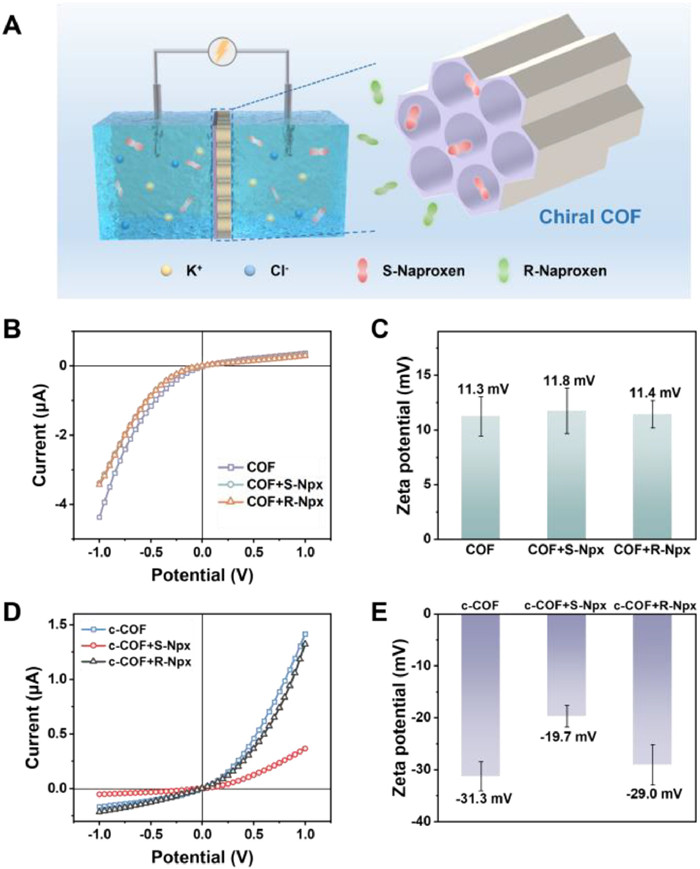 Figure 3.  (A) Chiral penicillamine-modified COF/AAO nanofluidic ICR membrane for enantioselective detection of enantiomer based on the electrochemical system. (B) - curves and (C) zeta potential of the COF/AAO nanofluidic membrane after Npx recognition. (D) - curves and (E) zeta potential of the c-COF/AAO membrane after Npx recognition.