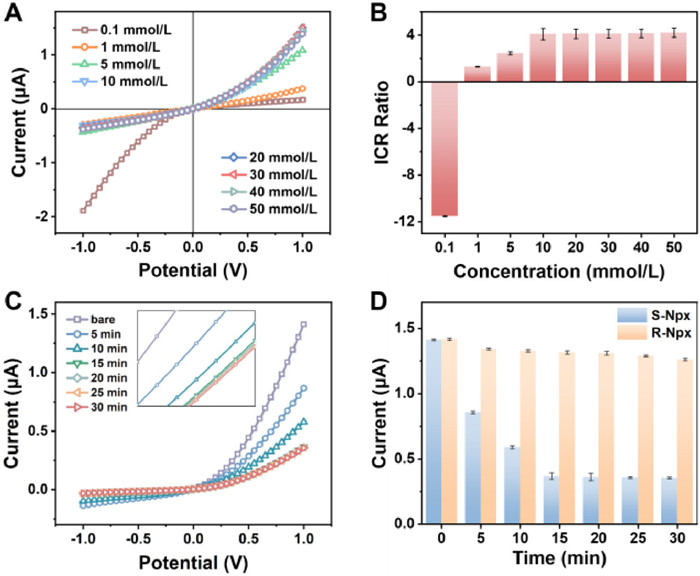 Figure 4  (A) - curves of the nanofluidic membrane after different concentration of l-Pen modification. (B) ICR ratio of the nanofluidic membranes after different concentration of l-Pen modification. (C) - curves of the c-COF/AAO membrane for recognizing S-Npx (0.1 mmol/L) at different reaction time. (D) Ion current at +1.0 Ⅴ (from panel C) at different Npx reaction time for the c-COF/AAO membrane.