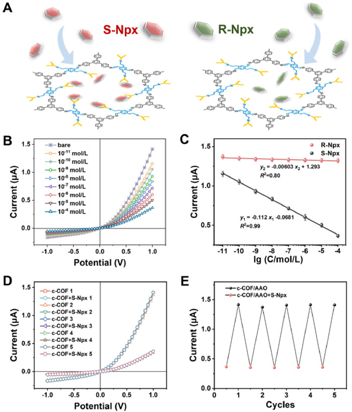 Figure 5  (A) Schematic illustration of S- or R-Npx recognition on c-COF. (B) - curves of the c-COF/AAO membrane recognizing S-Npx. (C) Standard curves of Npx of the c-COF membrane. (D) The - curves of the c-COF/AAO membrane through adding and removing S-Npx. (E) Reversible variation of ion current measured alternately at +1.0 Ⅴ.