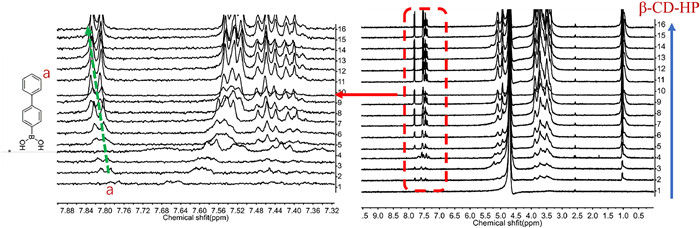 Figure 1.  The 1H NMR spectra (400 MHz, 298 K, D2O) of BOH (1.0 mmol/L) with the addition of 0–1.5 equiv. β-CD-HP (spectra from 1 to 16).