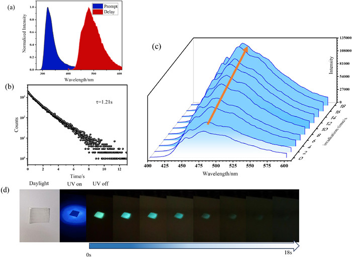 Figure 2  (a) Prompt and delayed phosphorescence spectra of PU@β-CD-HP film. Excitation by 254 nm, delayed time: 0.1 ms. (b) Lifetime decay curve of PU@β-CD-HP films collected at 480 nm. (c) Effect of light stimulation time on phosphorescent intensity of PU@β-CD-HP films. Excitation by 254 nm, delayed time: 0.1 ms. (d) The photographs of PU@β-CD-HP after UV irradiation.