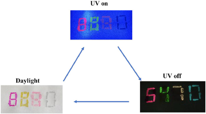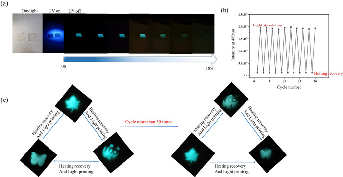 Figure 3  (a) Comparison of the same batch of PU@β-CD-HP films treated with unphotoactivated and photostimulated fluorescence in sun-light and delayed fluorescence after irradiation with ultraviolet lamp. (b) Phosphorescent intensity spectra under photostimulus/thermal reduction cycles at 480 nm. (c) Photoprint pattern and thermal erase cycle diagram.