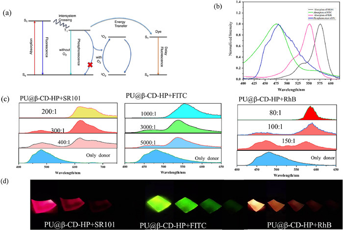 Figure 4  Luminous properties of PU@β-CD-HP +acceptor-dyes films. (a) Simplified Jablonski diagram for ultralong phosphorescence and full-color energy transfer process. (b) Normalized emission spectrum of PU@β-CD-HP (λex = 254 nm, delayed time = 0.1 ms) and absorption spectra of SR101, FITC and RhB (λex = 254 nm). (c) Delayed emission spectra of PU@β-CD-HP with different acceptor concentrations under ambient conditions (the left is PU@β-CD-HP +SR101, the middle is PU@β-CD-HP+FITC, right is PU@β-CD-HP+RhB (λex =254 nm, delayed time = 0.1 ms). (d) Full-color afterglow photographs of PU@β-CD-HP films doped with different acceptors under ambient conditions (the left is PU@β-CD-HP +SR101 films, [PU@β-CD-HP]:[SR101] is 200:1; the middle is PU@β-CD-HP+FITC film, [PU@β-CD-HP]:[FITC] is 1000:1; right is PU@β-CD-HP+RhB film, [PU@β-CD-HP]:[RhB] is 80:1).