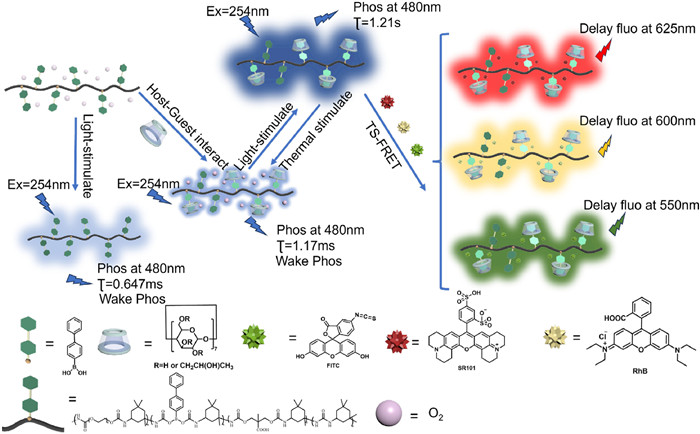 • The increasing demand for high-performance functional materials [1,2] has sparked significant interest in stimuli-responsive materials [36] as a novel class of smart materials. Stimuli-responsive materials have the ability to change their physical or chemical properties in response to variations in external stimulus, enabling real-time monitoring of the environment and intelligent responsiveness. Compared to conventional organic fluorescence materials, purely organic room-temperature phosphorescence (RTP) materials [712] hold tremendous potential in various fields including information anti-counterfeiting [13], information storage [14], and bioimaging [15] due to their unprecedented photophysical properties such as long lifetimes, special radiation channels, and large Stokes shifts. However, achieving organic phosphorescence emission at room temperature remains challenging. In general, two conditions are required for achieving RTP emission: (1) Promoting intersystem crossing (ISC) from the singlet to triplet states [16]; (2) Reducing nonradiative deactivation of triplet states, ensuring they remain active long enough to emit phosphorescence [17]. Current strategies include introducing heavy atoms into chromophores [18], embedding chromophores in matrices [19], crystallization [20], polymerization [21], molecular aggregation (including H-aggregation, π–π stacking, and n–π stacking) [22], host-guest complexation [23], carbon quantum dots [24] and clustering trigger emission [25], etc. For example, Kim et al. introduced a strong non-covalent interaction between the two molecules into the system. One of them is the halogen bond between phosphors, which can not only promote the ISC process, but also inhibit the vibration of the phosphors. The other comes from the strong hydrogen bond interaction between the host matrix and phosphor groups to more effectively inhibit the diffusion/vibration of the matrix and the phosphors [26]. Fraser et al. introduced heavy iodine atoms into a dual-emission polymer system. During polymerization, they systematically varied the chain length of polylactic acid (PLA), achieving adjustment of the relative intensities of fluorescence and phosphorescence [27]. Since Turro et al. proposed that β-CD can induce RTP, macrocyclic molecules gradually entered researchers' field of view; similar to how polymer matrices provide a rigid environment, they can also restrict the vibration of guest molecules, preventing their quenching by external oxygen and moisture [28]. Liu et al. prepared highly efficient RTP materials by doping 6-bromoisoquinoline-modified β-CD into acrylamide and polymerizing them via simple in situ>the photopolymerization [29]. Zhang et al. coupled diboron diphenylmethane with PLA, obtaining single-component multi-emissive materials. This method not only significantly enhanced the fluorescence quantum yield but also yielded oxygen-sensitive green RTP and temperature-sensitive delayed fluorescence [30]. Although significant progress has been made explored it is regrettable that most RTP materials exist in the form of crystals or rigid materials, making them difficult to further process and plasticity, which significantly hinders their practical applications. Polyurethane [3134] is an elastomer with excellent mechanical properties and easy processing, but few phosphorescent materials based on polyurethane have been reported. Therefore, combining polyurethane with cyclodextrin-based supramolecular systems may yield flexible supramolecular phosphorescent nanomaterials with both stretch and luminescent properties. This could provide an effective and environmentally sustainable alternative for optical materials and stimulate new ideas in phosphorescent material research. However, macrocyclic confinement effect and polymerization in situ cooperative expansion supramolecular elastomers RTP still face challenges. Especially, the macrocycle confinement effect [35,36], triplet-to-singlet Förster resonance energy transfer (TS-FRET) [37] achieved multicolor delayed phosphorescence (this refers to persistent luminescence) report is still rare to the best of our knowledge.