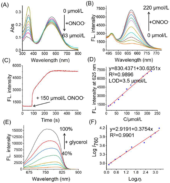 Figure 1  Spectral properties of YLS toward ONOO and viscosity. (A) UV–vis titration of 10 µmol/L YLS with 0–63 µmol/L ONOO. (B) Fluorescence titration of 10 µmol/L YLS with 0–220 µmol/L ONOO. (C) Time-dependent fluorescence responses of YLS toward 150 µmol/L ONOO. (D) Detection limit of YLS for ONOOex = 440 nm. λem = 625 nm, slit width: 5 nm/5 nm). (E) Fluorescence responses of 10 µmol/L YLS toward viscosity. The different viscosity was mimicked by different methanol/glycerol volume ratios mimicked the different viscosity. (F) Linear relationship between logI760 nm and logη.