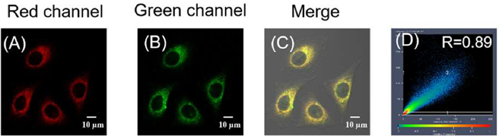 Figure 2.  Colocalization of YLS in HeLa cells. (A) Fluorescence imaging of cells incubated with 10 µmol/L YLS. Red channel: λex = 561 nm, λem = 630–670 nm. (B) Fluorescence imaging of 0.2 µmol/L Mito-Tracker Green stained cells. Green channel: λex = 488 nm, λem = 510–540 nm. (C) Merged image of the two channels. (D) Correlation analysis.