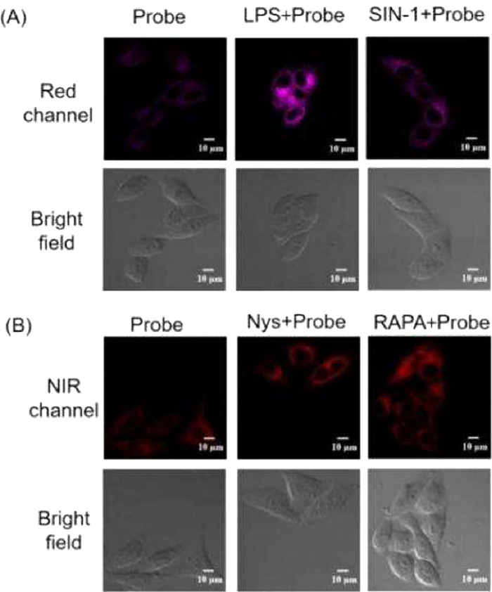 The cellular ONOO responsive specificity of YLS was further confirmed by stimulants such as lipopolysaccharide (LPS) and 3-(4-morpholinyl)sydnonimine hydrochloride (SIN-1). LPS is an endotoxin from Gram-negative bacteria that strongly activates the immune system and mimics the inflammatory response to infection or injury [33]. SIN-1 releases nitric oxide (NO) and O2•− under physiological conditions, and these two substances react rapidly to generate ONOO [34]. During the experiment, HL-7702 cells were treated with 1 µg/mL of LPS and 100 µmol/L of SIN-1 for 20 min, respectively, followed by a 15 min incubation of 10 µmol/L YLS for laser confocal microscopy imaging analysis. Indeed, both LPS and SIN-1 induced significant fluorescence enhancement in the red channel and confirmed the specificity of YLS for ONOO (Fig. 3A).