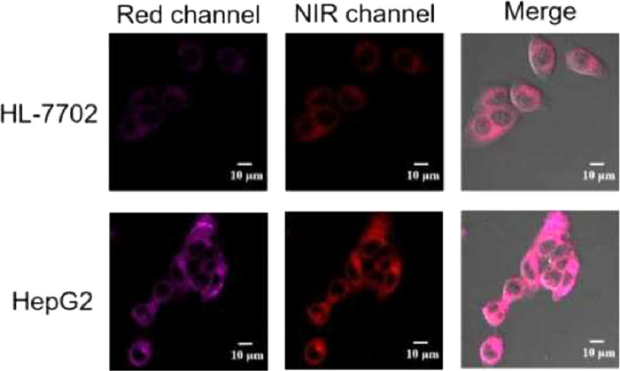 Figure 4.  Two-channel fluorescence imaging of 10 µmol/L YLS in HL-7702 cells. Red channel: λex = 561 nm, λem = 630–670 nm; NIR channel: λex = 633 nm, λem = 700–754 nm.