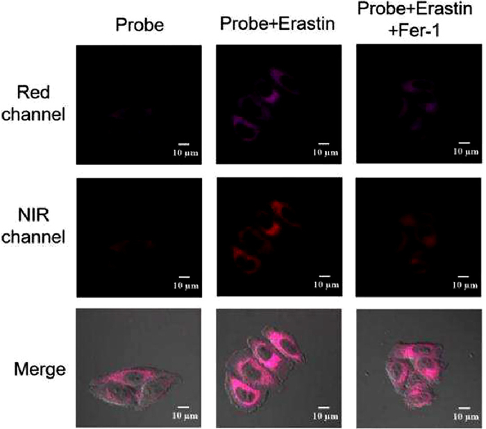 Figure 5.  Two-channel fluorescence imaging of 10 µmol/L YLS in a ferroptosis model of HeLa cells. Red channel: λex = 561 nm, λem = 630–670 nm; NIR channel: λex = 633 nm, λem = 700–754 nm.
