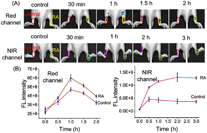 Figure 6.  Dual-channel in vivo fluorescence imaging of ONOO and viscosity in RA mice. Red channel: λex = 465 nm, DsRed; NIR channel: λex = 570 nm, Cy5.5. Data are presented as mean ± standard deviation (SD) (n = 3).