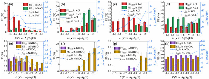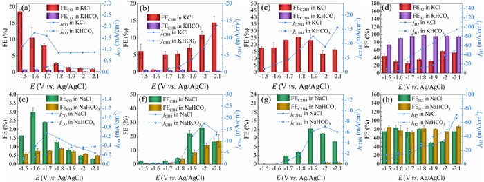 Figure 1.  Gas product selectivity and partial current density changes (effect of cations) of CF in 0.5 mol/L electrolyte at different potentials. KCl/NaCl solution: (a) FECO and jCO, (b) FECH4 and jCH4, (c) FEC2H4 and jC2H4, (d) FEH2 and jH2. KHCO3/NaHCO3 solution: (e) FECO and jCO, (f) FECH4 and jCH4, (g) FEC2H4 and jC2H4, (h) FEH2 and jH2.