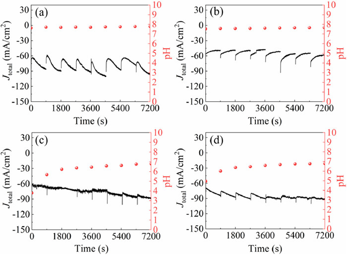 Figure 3  Changes of pH and current density in 0.5 mol/L electrolyte during ECO2R. Electrolyte: (a) KHCO3, (b) NaHCO3, (c) KCl, and (d) NaCl.