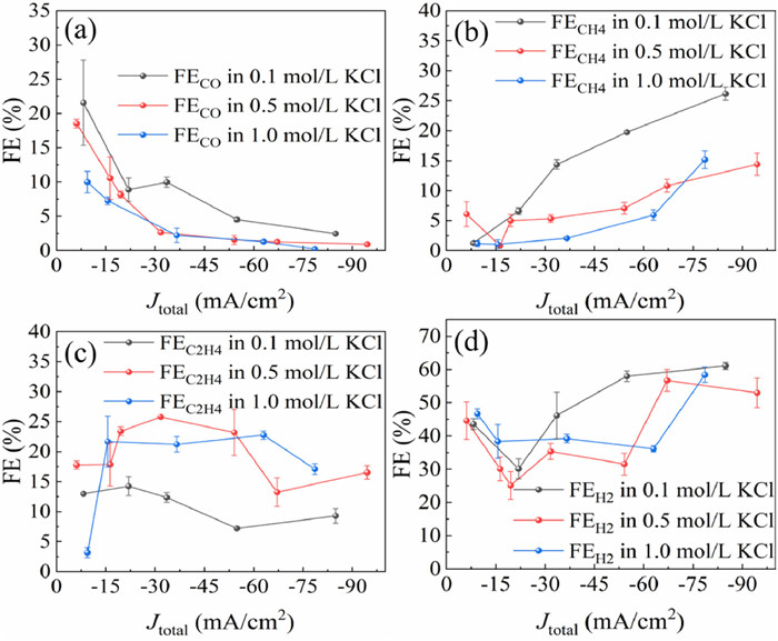 Figure 4.  Variation of gas product selectivity of CF with current density in different concentrations of KCl solution. (a) FECO, (b) FECH4, (c) FEC2H4, (d) FEH2.