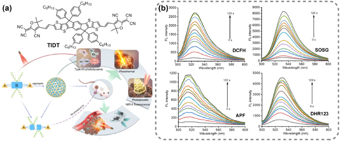 Figure 10 (a) The structure of TIDT and its biological applications. (b) Fluorescence spectral changes of TIDT NPs mixed with DCFH, SOSG, APF, DHR123 probes under 660 nm laser irradiation. Reproduced with permission [21]. Copyright 2024, Elsevier.