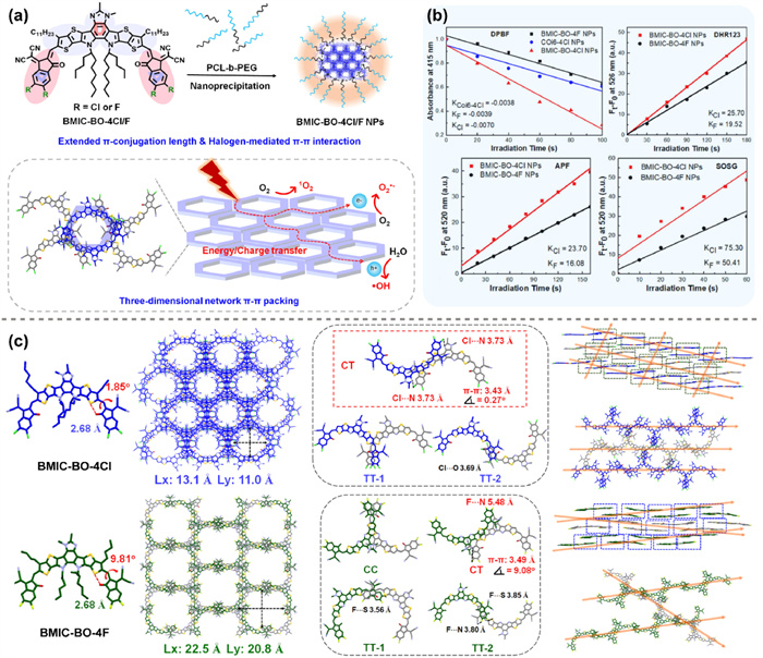Figure 11 (a) Illustration of A-D-A type π-conjugated small molecules, BMIC-BO-4Cl and BMIC-BO-4F. (b) ROS generation and fluorescence intensity change of DHR 123 (for O2•− detection), APF (for •OH detection) and SOSG (for 1O2 detection) in the presence of NPs. (c) Crystal structures and aggregation behaviors, packing modes, side and top views of the extended-crystal structure and energy/charge passages by single-crystal analysis. Reproduced with permission [51]. Copyright 2023, John Wiley and Sons.