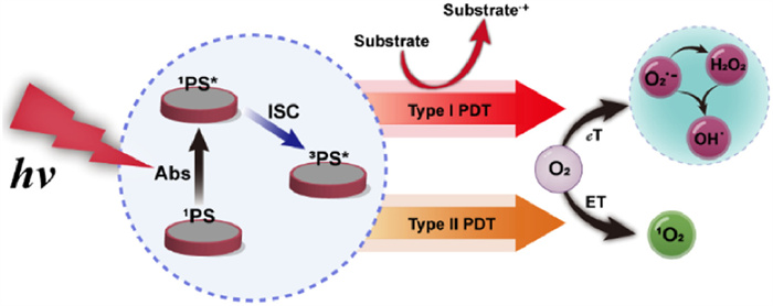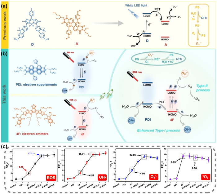 Figure 14 (a) The design concept of the type Ⅰ photosensitive system in the previous work. (b) Schematic diagram of enhancing the type Ⅰ sensitization process by promoting electron-hole pair separation. (c) ROS, •OH, O2•−, and 1O2 generation capabilities of different component NPs under the same conditions. Reproduced with permission [98]. Copyright 2024, John Wiley and Sons.
