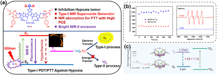 Figure 13 (a) The structure of Y6-Th and mechanism diagram. (b) Distribution of HOMO-LUMO on the energy level diagram and the energy levels and ΔET1-S0 values. (c) Fluorescence intensity changes and EPR spectrum of the mixed solution of Y6-Th NPs and corresponding probes under 808 nm laser irradiation. Reproduced with permission [44]. Copyright 2024, John Wiley and Sons.