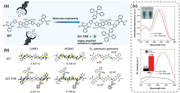 Figure 15 (a) Schematic diagram of IDT-TPE molecular engineering. (b) Distribution of HOMO-LUMO on the energy level diagram and optimized geometric configuration. (c) Absorption, fluorescence emission, and the corresponding fluorescence quantum yields (inset) of NPs. Reproduced with permission [26]. Copyright 2021, John Wiley and Sons.