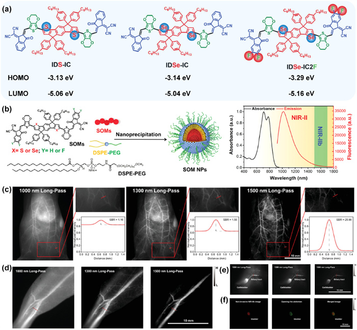 Figure 17 (a) Structures and the energy levels of the HOMOs and LUMOs of IDS-IC, IDSe-IC, and IDSe-IC2F. (b) The preparation of SOM NPs and absorption of IDSe-IC2F NPs. (c) Whole-body imaging and (d) hind limb imaging, as well as (e) biliary and (f) bladder imaging of IDSe-IC2F NPs in NIR-Ⅱ, NIR-Ⅱa, and NIR-Ⅱb windows. Reproduced with permission [24]. Copyright 2022, John Wiley and Sons.