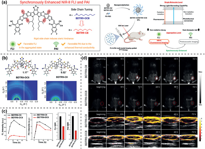 Figure 18 (a) Diagram of side chain regulation strategy. (b) The optimized geometries of BDTR9-OC8 and BDTR9-C8 and the 2D GIWAXS patterns of the films. (c) In vivo NIR-Ⅱ FLI and PAI of tumor at different time intervals and the signal to background ratio (SBR) for 24 h. (d) Imaging illustration related to (c). Reproduced with permission [45]. Copyright 2022, John Wiley and Sons.