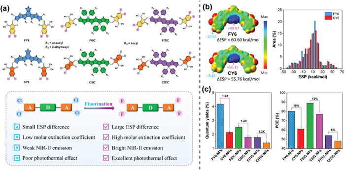 Figure 19 (a) Fluorination strategy. (b) ESP distributions and surface area distribution with different ESP. (c) Quantum yields and PCE of six NPs. Reproduced with permission [19]. Copyright 2022, John Wiley and Sons.