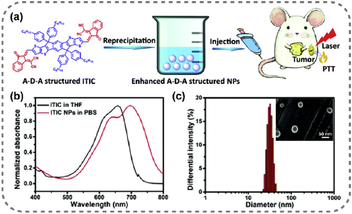 Figure 2 (a) Schematic diagram of ITIC structure and synthesis of nanomaterials for biological applications. (b) Absorption spectra of ITIC and ITIC NPs. (c) DLS and TEM images of ITIC NPs. Reproduced with permission [17]. Copyright 2019, Royal Society of Chemistry.