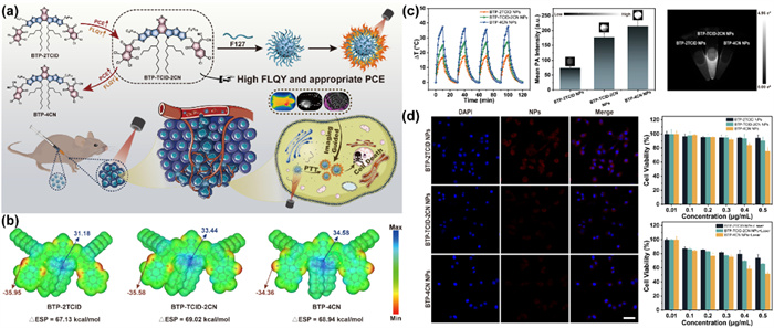 Figure 20 (a) Schematic diagram of nitrile-induced molecules enabling balance between NIR-Ⅱ FLI and PTT/PAI. (b) ESP distributions. (c) Temperature elevation, PA intensities and NIR-Ⅱ fluorescence images of different NPs. (d) Live/dead assay, dark-toxicity and phototoxicity of different NPs. Reproduced with permission [50]. Copyright 2023, Royal Society of Chemistry.