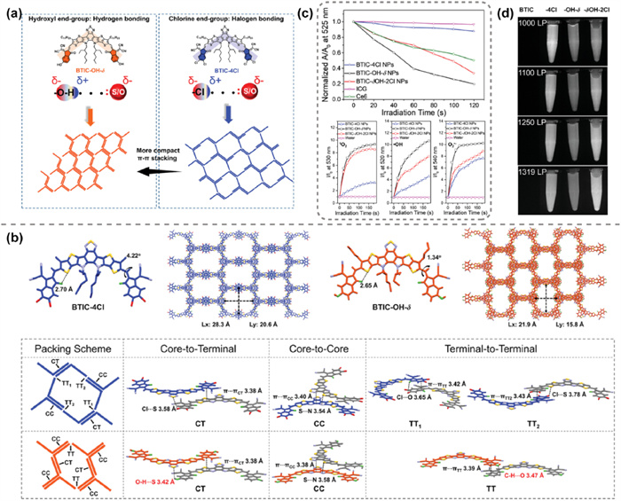 Figure 21 (a) Hydroxyl end-group regulation strategy. (b) The single-crystal structures and molecular packing of BTIC-4Cl (blue) and BTIC–OH-δ (red) by single-crystal data analysis. (c) Plots of decomposition rates of DPBF (for general ROS detection) and relative PL intensity of SOSG (for 1O2 detection), APF (for •OH detection), and DHR 123 (for O2•− detection). (d) NIR-Ⅱ fluorescence images of three NPs dispersed in water under 808 nm laser irradiation. Reproduced with permission [39]. Copyright 2023, John Wiley and Sons.