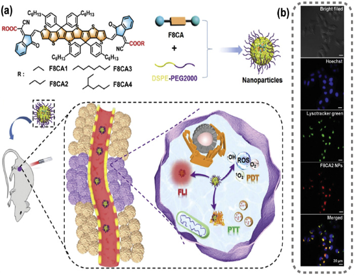 Figure 22 (a) The structure of F8CA1-F8CA4, nanoparticle preparation, and biological application. (b) Lysosome co-localization experiment. Reproduced with permission [32]. Copyright 2023, John Wiley and Sons.