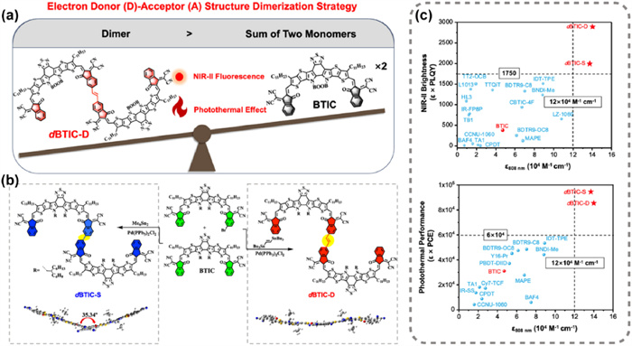 Figure 23 (a) Schematic diagram of π-conjugated extension strategy for dimerization. (b) Synthetic routes of dBTIC-S and dBTIC-D. (c) Comparison of fluorescence and photothermal properties between monomer and dimer. Reproduced with permission [109]. Copyright 2024, John Wiley and Sons.