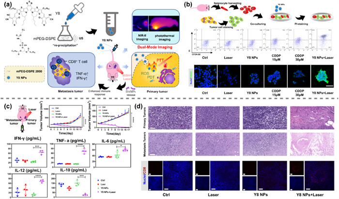 Figure 24 (a) Fabrication of Y8 NPs and in vivo validation of dual-mode imaging/PTT/PDT/photoimmunotherapy after Y8 NPs injection. (b) Cellular apoptosis and HMGB1 fluorescence staining images of tumor cells. (c) Primary and metastasis tumor growth and the relative serous cytokines of mice in different groups after treatments. (d) H & E staining of primary and metastasis tumors and CD8 fluorescence images of metastasis tumor tissues. Reproduced with permission [43]. Copyright 2021, American Chemical Society.