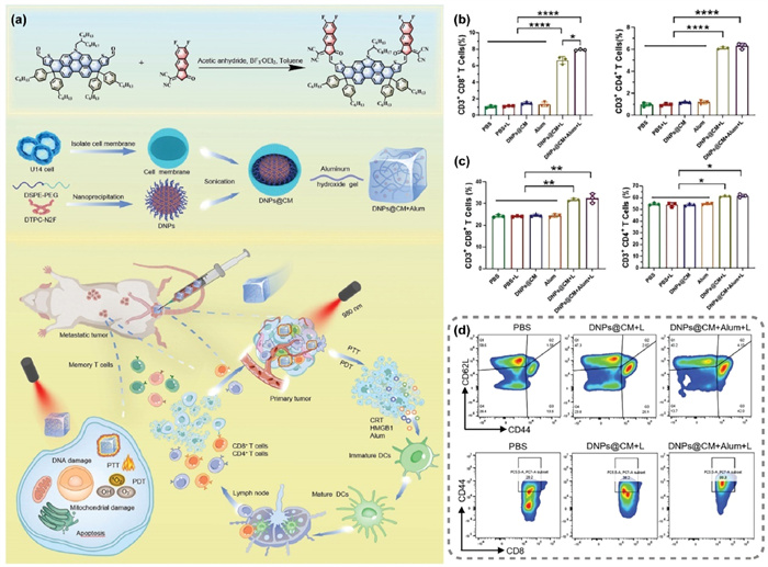 Figure 25 (a) Schematic diagram of photoimmunotherapy for in situ cervical cancer treatment using DNPs@CM+Alum. (b) Quantification of FCM analysis of tumor-infiltrating CD8+ T cells (CD3+ CD8+) and CD4+ T cells (CD3+ CD4+) in different treatment groups (n = 3). (c) Quantification of FCM analysis of CD8+ T cells (CD3+ CD8+) and CD4+ T cells (CD3+ CD4+) in the spleens of different treatment groups (n = 3). (d) FCM analysis of memory cells in the spleen (CD3+ CD8+ CD44+ CD62L− and CD3+ CD8+ CD44+ CD62L+) (n = 3) and the tumor-infiltrating memory T cells (CD3+ CD8+ CD44+) (n = 3). The data are presented as the mean ± SD. The p values were calculated using two-tailed unpaired t-tests or one-way ANOVA, P < 0.05, **P < 0.01, ***P < 0.001. Reproduced with permission [54]. Copyright 2024, John Wiley and Sons.