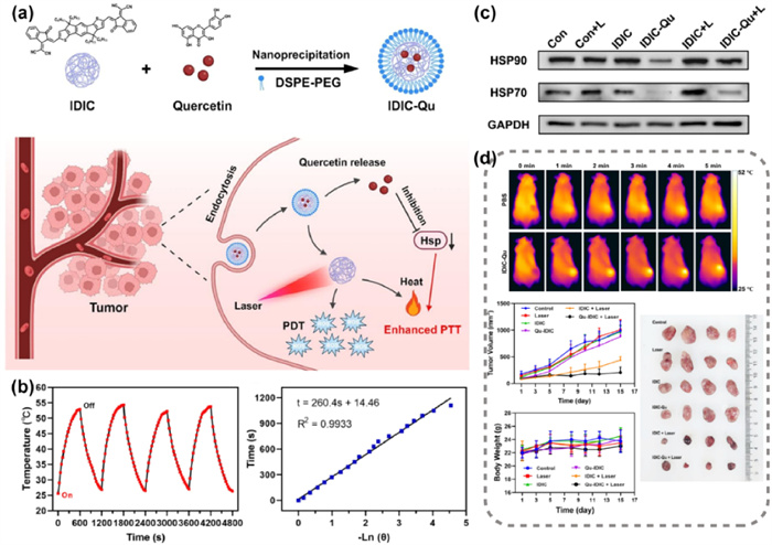 Figure 26 (a) Synthesis process and schematic illustration of IDIC-Qu for enhanced cancer PTT. (b) Temperature variation of IDIC-Qu NPs for four cycles of repeated 660 nm laser irradiation (switch on/off) and the linear data obtained from the cooling period. (c) The expressions of HSP70 and HSP90 in 4T1 cells after different treatments were detected by Western blot (L is the abbreviation of laser). (d) Thermogram, tumor growth and weight changes of tumor-bearing mice and the digital photographs of the corresponding tumor after treatments. Reproduced with permission [25]. Copyright 2024, Elsevier.
