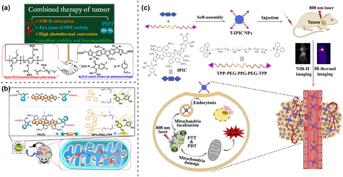 Figure 27 (a) Schematic illustration of DPIC NPs and the application. Reproduced with permission [34]. Copyright 2022, Springer Nature. (b) Chemical structures of F8CA5 and WP5−2PEG−2TPP and the phototheranostics application of F8CA5 NPs. Reproduced with permission [31]. Copyright 2023, American Chemical Society. (c) Schematic illustration of one-for-all phototheranostic nanoparticles for NIR-Ⅱ/IR thermal imaging guided mitochondria-targeting phototherapy. Reproduced with permission [20]. Copyright 2020, Elsevier.