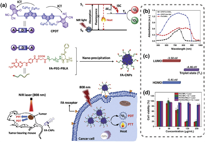 Figure 3. (a) Schematic diagram of CPDT structure and synthesis of FA-CNPs for biological applications. (b) Absorption spectra. (c) HOMO-LUMO energy level diagram. (d) Survival rate of Hela cells under different conditions. Reproduced with permission [37]. Copyright 2020, John Wiley and Sons.Furthermore, as elucidated in Fig. 4, leveraging the superior electron-donating capacity of the thiophene ring over the benzene ring, the benzene ring in the electron-rich core of ITTC was strategically replaced with a fused-thiophene unit, yielding the ETTC molecule [18,27]. This strategic substitution enhances the D-A interaction, resulting in a pronounced red shift of the maximum absorption peak to 750 nm. The ETTC molecule not only maintains the synergistic PTT/PDT therapeutic efficacy but also unveils superior NIR-Ⅱ fluorescence/photoacoustic imaging capabilities, paving the way for PTT/PDT synergistic therapy guided by advanced NIR-Ⅱ imaging modalities.