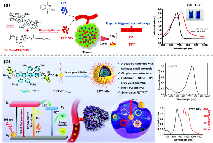 Figure 4. (a) Schematic diagram of ITTC structure, synthesis of ITTC NPs for biological applications and the absorption spectra. Reproduced with permission [18]. Copyright 2021, Royal Society of Chemistry. (b) Schematic diagram of ETTC structure, synthesis of ETTC NPs for biological applications and the absorption spectra. Reproduced with permission [27]. Copyright 2021, Royal Society of Chemistry.2.2 A-D-A'-D-A type