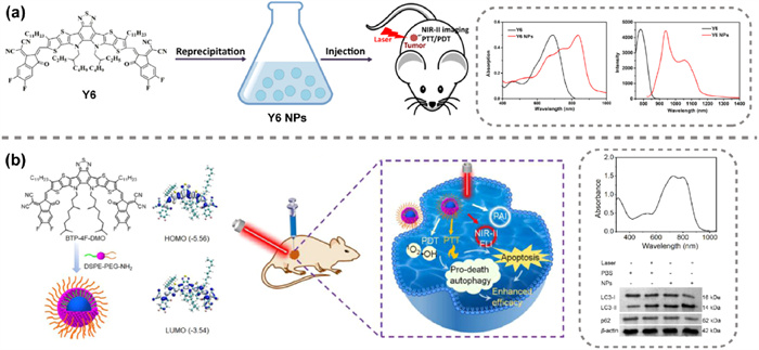 Figure 5 (a) Schematic diagram of Y6 structure, preparation of nanoparticles, absorption and emission spectra and biological applications. Reproduced with permission [41]. Copyright 2021, American Chemical Society. (b) Structure of BTP-4F-DMO, preparation of nanoparticles, absorption spectra, expression of characteristic proteins, and schematic diagram of biological applications. Reproduced with permission [49]. Copyright 2023 Elsevier.