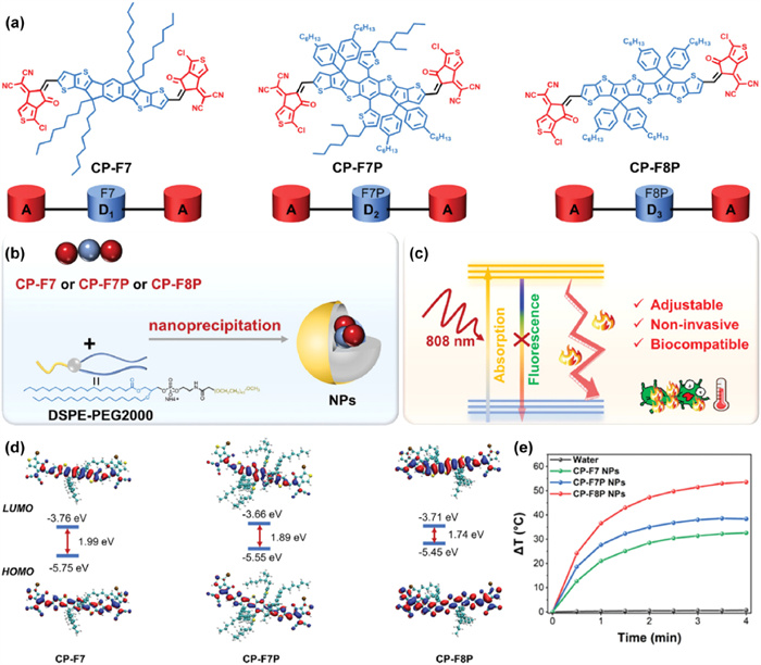 Figure 8 (a) The structures of CP-F7, CP-F7P and CP-F8P. (b) Preparation of the NPs. (c) Illustration of energy release and biological application. (d) HOMO-LUMO energy level diagram. (e) Comparison of heating capabilities. Reproduced with permission [28]. Copyright 2023, John Wiley and Sons.