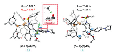 Figure 3.  The geometries and relative free energies (ΔΔG, in kcal/mol) of the transition state [CuL6]-(R)-TSE and [CuL6]-(S)-TSE were computed at the SMD (solvent = dichloroethane)-M06-D3/6–311++G(d, p)-SDD//B3LYP-D3/6–31G(d)-LANL2DZ level of theory. Color code: red = O; white = H; gray = C; yellow = S; blue = N; orange = P; brown = Cu.